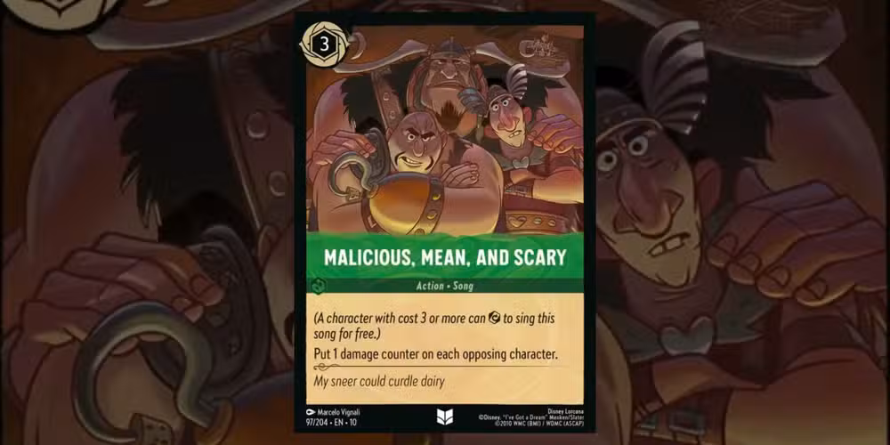 La carta de canción “Malicioso, malo y aterrador” también podría ser una buena estrategia para limpiar el tablero de enemigos de bajo costo. Una vez cantado, Se coloca un contador de daño en cada personaje contrario.desterrando efectivamente a todos los personajes que solo tienen una defensa.
