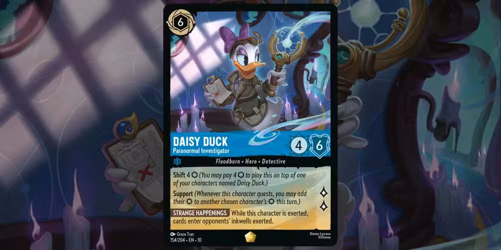 Esta “Pata Daisy – Investigadora Paranormal” es un personaje divertido que también tiene hermosas ilustraciones y combina perfectamente con Susurros en el pozoEl tema detectivesco. Usando la habilidad Shift, se puede jugar con solo cuatro tintas, y impedirá que los oponentes puedan usar cualquier carta recién entintada en turnos cuando Daisy se esfuerza.