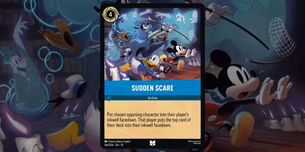 Por lo tanto, podrías sacar “Sudden Scare” como una forma de Quitar rápidamente una carta de personaje peligroso del tablero.y al colocarlo en el tintero en lugar de desterrarlo, los jugadores no podrán volver a jugarlo.