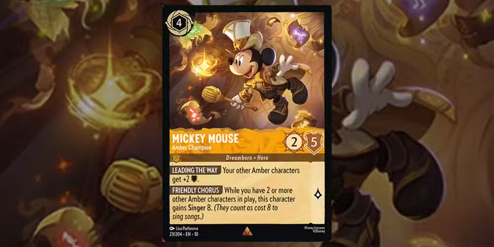 esta nueva “Mickey Mouse – Amber Champion” será imprescindible en todas las barajas de Amber.. Un personaje entintable que cuesta solo cuatro, su habilidad Leading the Way les da a todos los demás personajes de Amber dos extra para sus defensas. Además, siempre que los jugadores tengan dos o más personajes de Amber en juego, Mickey puede cantar canciones para ocho.