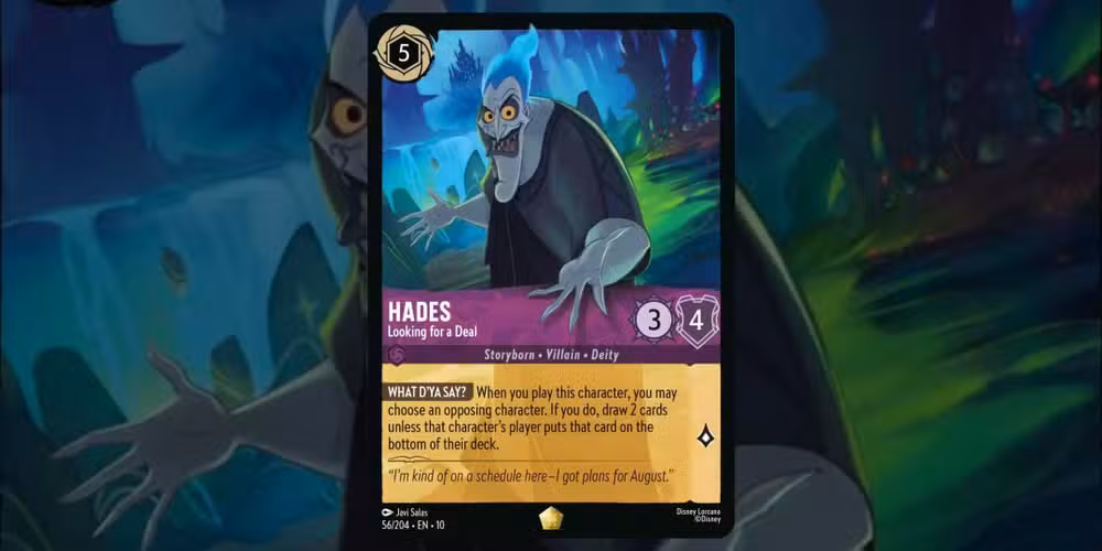 La habilidad de esta carta “Hades – Buscando un trato” es demasiado divertido para dejarlo pasar. Encaja perfectamente con Hades y es una forma estratégica de obtener ventaja. Cuando se juega Hades, puedes elegir un personaje contrario que luego debe colocarse en la parte inferior del mazo de ese jugador o puedes robar dos cartas.