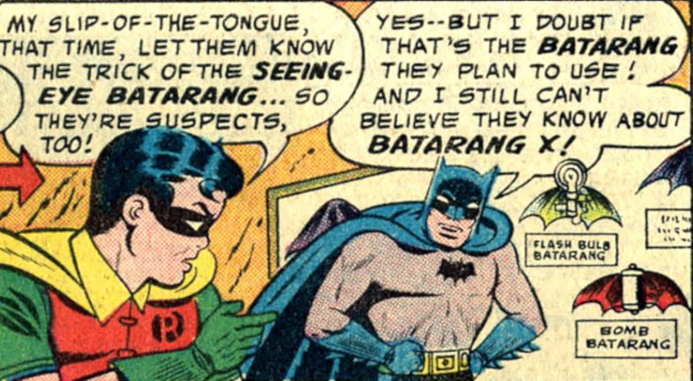Visto por primera vez y únicamente en “¡Los 100 Batarangs de Batman!”, este Batarang nunca se usa en el número. Sin embargo, es fácil imaginar lo que podría ser capaz de hacer. Batman ha utilizado muchos trucos para confundir y desorientar a sus enemigos a lo largo de los años, y una de las formas más sencillas de hacerlo es con una versión voladora de una granada flashbang. Batman tiene entrenamiento como ninja, y algo en lo que los ninjas son geniales es en lanzar algo que les permita escapar rápidamente. Un Batarang flashbang lograría esto perfectamente.