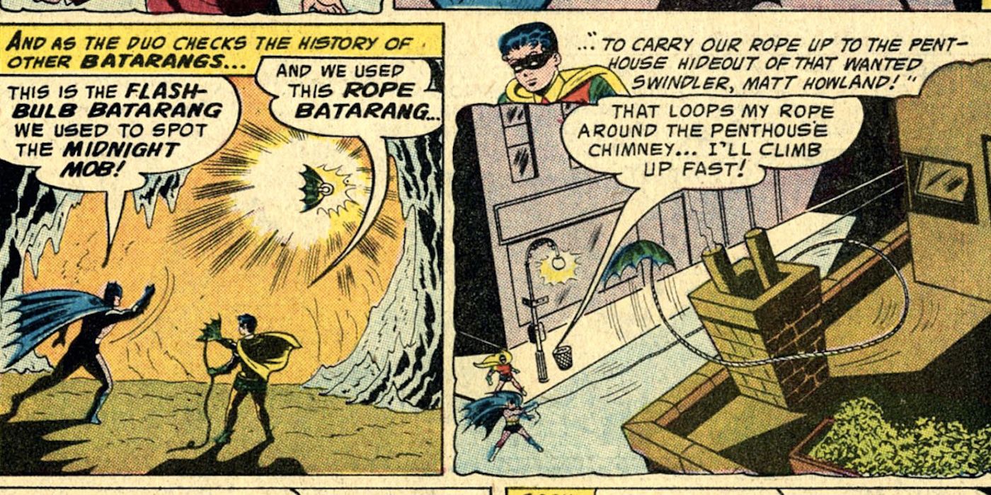Uno de los aspectos más importantes de actuar como ninja y justiciero es poder llegar a lugares difíciles de alcanzar. Si bien Batman normalmente usa su rezón para hacer esto, no es su única opción. Visto en Cómics de detectives #244, Batman usa el Rope Batarang para escalar la cima de un edificio.