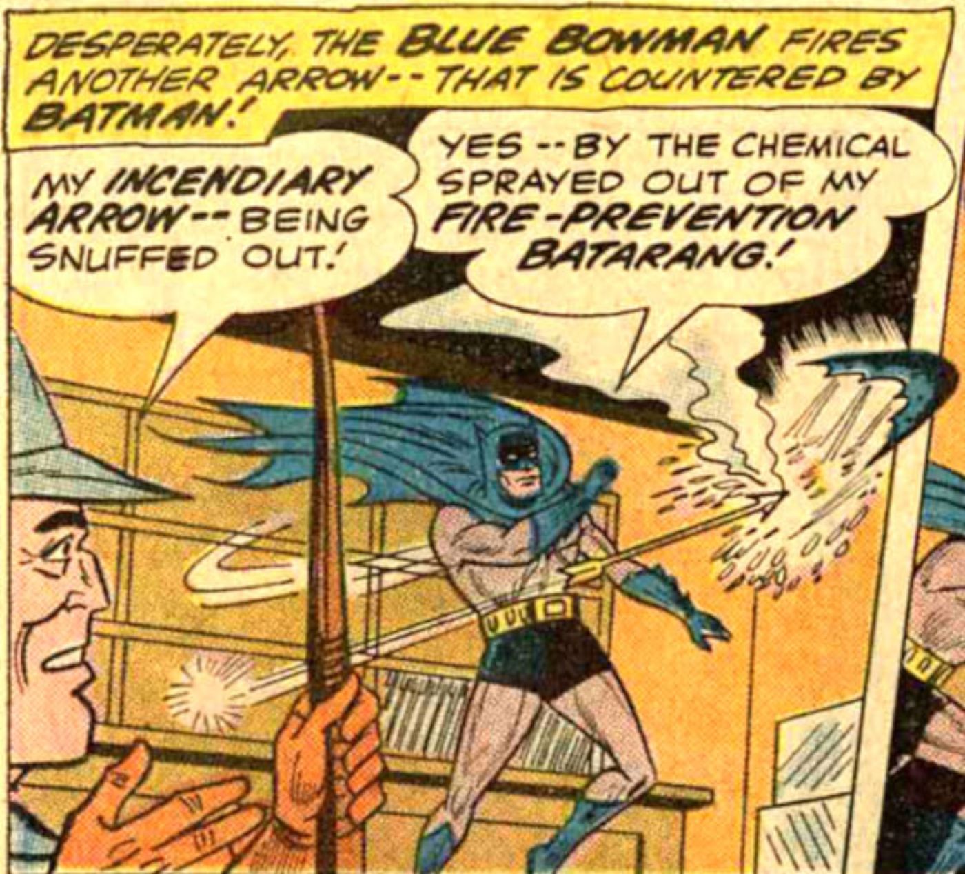 Este Batarang rocía sustancias químicas que extinguen el fuego. mientras vuela por el aire. Este Batarang permite así a Batman echar una mano en un infierno mortal desde una distancia segura, sin necesidad de manguera ni boca de incendio. Fue visto por primera vez hace mucho tiempo. hombre murciélago #139 de Bill Finger, Sheldon Moldoff y Stan Starkman.