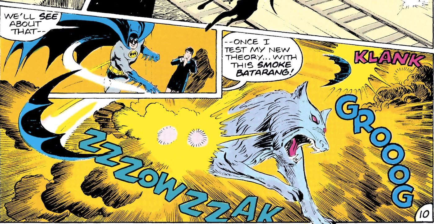Como se dijo anteriormente, Batman es esencialmente un ninja y, a menudo, necesita desaparecer como tal. Por lo general, Batman usará sus bolitas de gas, que a menudo deja caer cuando necesita hacer una retirada llena de humo. Sin embargo, estas no son sus únicas opciones, como se ve en Lo mejor del mundo #323 de Joey Cavalieri, José Delbo, Alfredo Alcalá, Duncan Andrews y Nansi Hoolahan. En este asunto, Batman lanza un Batarang de humo para distraer y desorientar. uno de los lobos espectrales de Nightwolf. Esto distrae a la bestia el tiempo suficiente para que Batman se retire y salve al civil que está siendo atacado.