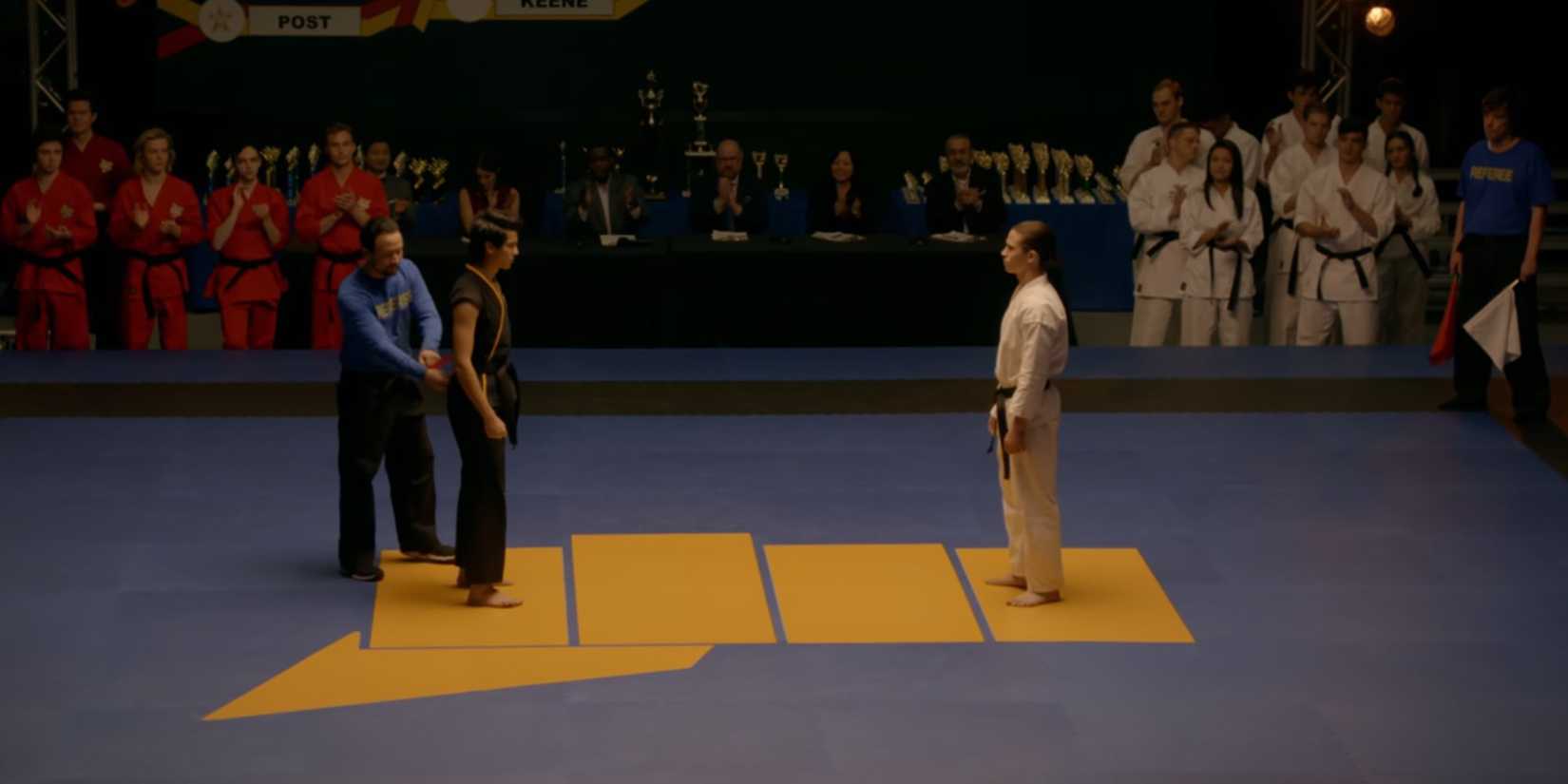 Lo que sigue es una de las mejores secuencias de lucha en Cobra Kai serie, con Robby logrando bloquear y hacer retroceder a todo el equipo a la vez. Tiene éxito durante un largo período de tiempo, antes de que Tory finalmente consiga un golpe bajo y Robby se prepare para irse. Sin embargo, sus habilidades impresionaron al grupo y le valieron el respeto y el reconocimiento que merecía como un competidor increíblemente duro.