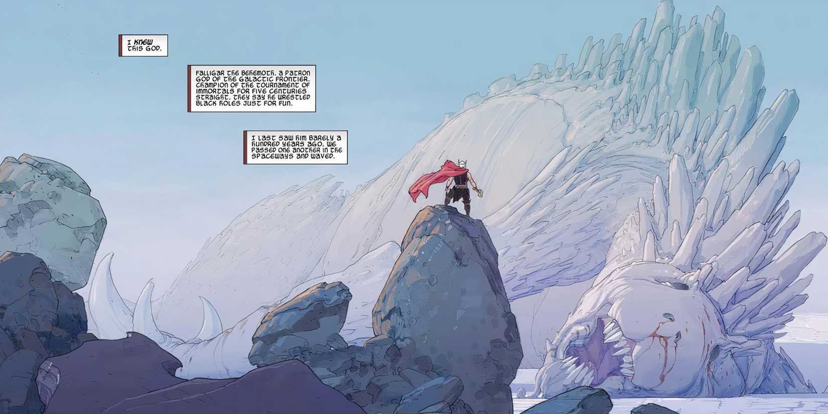 Algunas tomas son tan grandiosas y audaces que simplemente deben trasladarse al cine lo más fielmente posible. El equipo creativo detrás Thor: amor y trueno Hizo precisamente eso con un disparo que los fanáticos de la carrera de Jason Aaron sobre Thor sin duda recuerdan. En la película del MCU, Thor se topa con los restos de Falligar the Behemoth, un dios que ha sido asesinado por el villano Gorr the God Butcher.