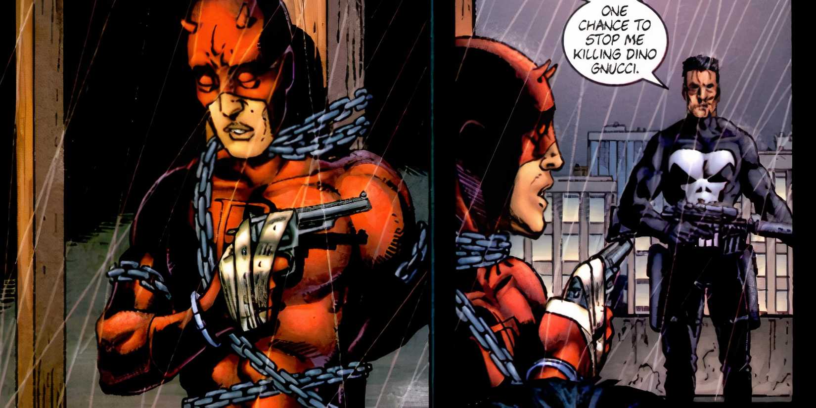 No son sólo las películas las que hacen un gran trabajo al capturar los aspectos más destacados de Marvel Comics. La segunda temporada de Daredevil adaptó uno de los mejores enfrentamientos entre Matt Murdock y Frank Castle en el episodio “New York’s Finest”. The Punisher capturó a Daredevil y lo encadenó a un techo. con nada más que una pistola atada con cinta adhesiva a su mano. Frank le da a Matt la opción de dispararle a Punisher o quedarse quieto y verlo matar a un criminal.