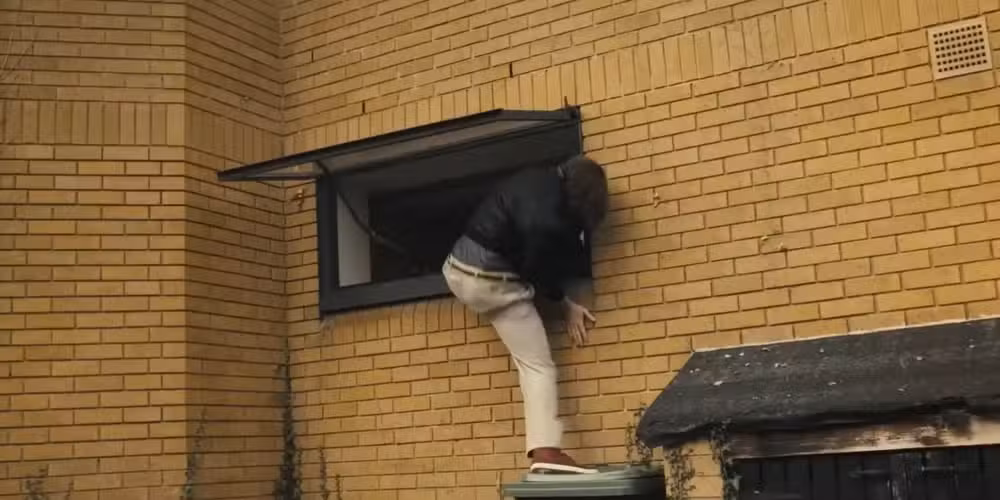 Sin embargo, sus pantalones no logran regresar al interior con él. A pesar de que el muro no es muy alto, Alan lucha por volver a entrar y de alguna manera logra pasar sus piernas por la ventana antes que el resto de él. Divertidamente, la ventana se cierra a su alrededor, donde sus pantalones quedan atrapados en el pestillo, dejándolo colgando en el aire, a mitad de camino.