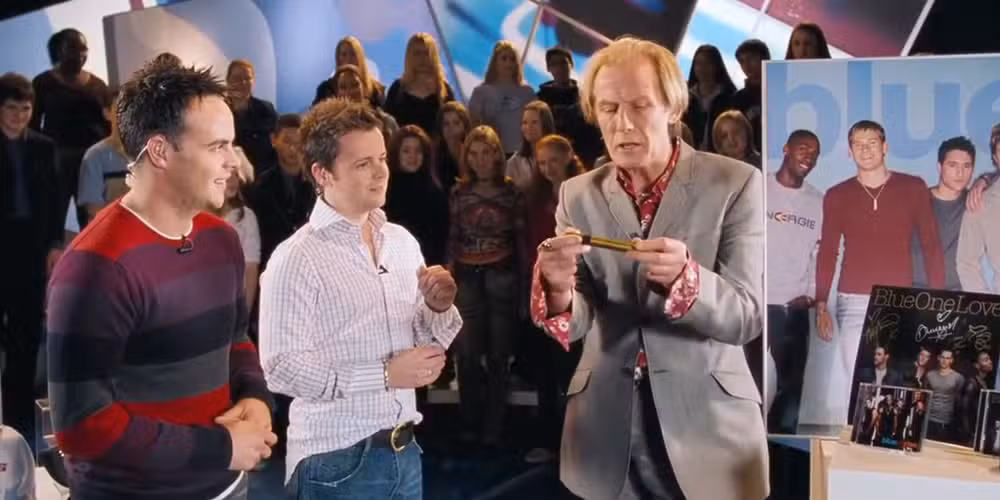 La frase más divertida de esta escena, con diferencia, es cuando les dice a los niños del público que no compren drogas, y en lugar de “conviértete en una estrella del pop y te los regalan.” Esto hace que los presentadores Ant y Dec lo interrumpan rápidamente, pero sus expresiones faciales en respuesta a sus desquiciados divagaciones en el aire son hilarantes.