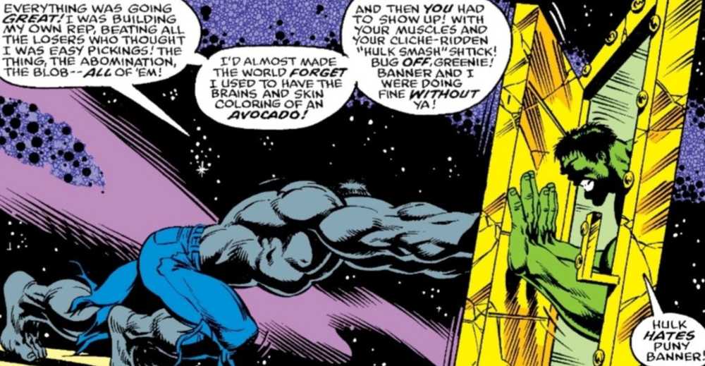 Los cascos grises y verdes tienen una reunión de las mentes dentro del cerebro de Bruce Banner en El increíble casco #377, estableciendo el funcionamiento psicológico de Hulk como personaje. Es un momento importante que agrega complejidad al personaje, y es exactamente lo que exige una representación de la película.