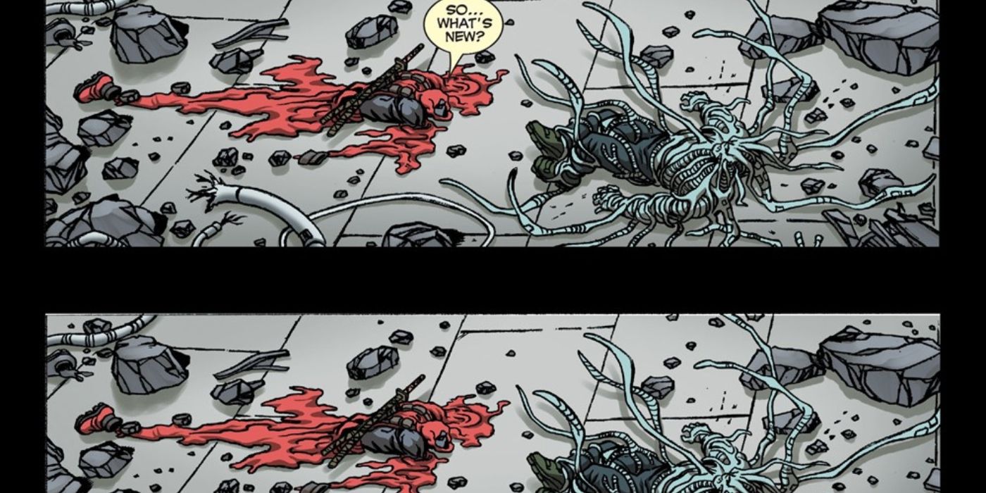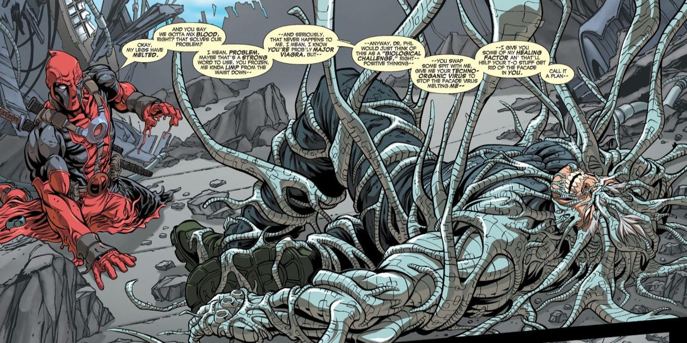 “/> El chiste de viagra de Deadpool no fue el único chiste que hizo sobre Cable mientras el virus tecno-orgánico del mutante consumía todo su cuerpo, pero lo curioso es que Deadpool realmente no estaba en posición de burlarse de nadie, ya que estaba pasando por algo igualmente horrible. Deadpool recibió la experimentación de modificación corporal del culto religioso, que terminó teniendo efectos secundarios aterradores. Deadpool literalmente se estaba derritiendo en un charco de agonía interminable mientras el cuerpo de Cable se contorsionaba grotescamente. y dolorosamente destrozado por la cibernética en constante expansión que surge de él.