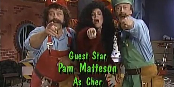 De las diversas apariciones de invitados en el programa, que son todas absurdas de una forma u otra, hay una aparición particular de invitados que se destaca como exagerada. Pam Matteson aparece en el programa parodiando a Cher, y ella trae consigo a su Bulldog Inglés, con quien Mario cambia de cuerpo.