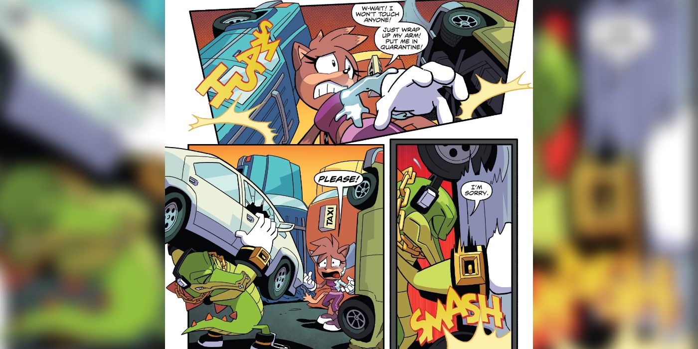 Otro momento oscuro de Metal Virus Saga de IDW, esta escena en particular está inspirada en uno de los tropos más efectivos en las películas de apocalipsis zombie. Toda la saga, por supuesto, se inspira en el género en general, pero esta escena con Vector the Crocodile y un ciudadano infectado encabeza la lista en todo el arco por lo bien que imita este tipo de películas de terror. El miedo que experimenta cierta ciudadana después de infectarse con un virus que la convertirá en una acertadamente llamada “zombot” está perfectamente ejecutado, y el hecho de que el héroe Vector the Crocodile tenga que tomar una decisión bastante brutal en beneficio de todos los demás que traumatizan aún más a la víctima solo se suman a la atmósfera oscura que satura la escena.