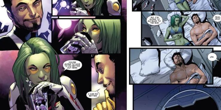 A lo largo de la MCU, nunca pareció que hubiera una posibilidad de que Gamora y Tony (Robert Downey Jr.) se conectaran. Para empezar, Tony ya estaba en una relación con Pepper Potts (Gwyneth Paltrow) y Gamora estaba con Star-Lord. Al mismo tiempo, no parece que estos personajes se hayan interesado el uno por el otro. En los cómics, sin embargo, se conectan en un momento. Todo comenzó cuando Tony estaba con los Guardianes. Un minuto, estaban brindando por Groot y Gamora estaba hablando con Tony sobre impresionar a las mujeres. Al siguiente, estaban juntos en la cama.