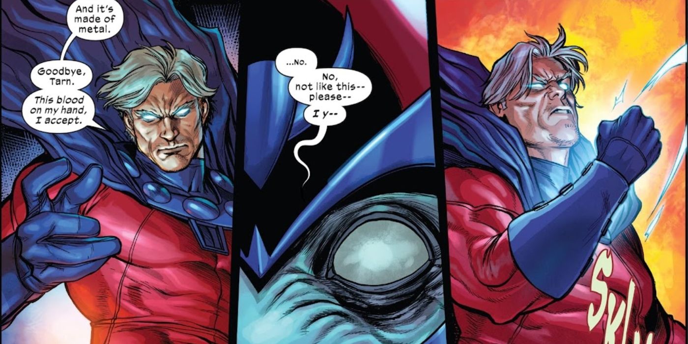 - Las peleas de Magneto, incluido el brutal asesinato de Tarn y la división de Apocalipsis por la mitad, muestran su poder despiadado.
