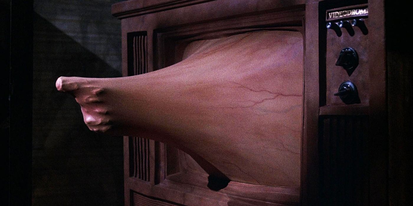 “/> David Cronenberg Videodromo sigue a Max Renn (James Wood), el presidente de un canal de televisión de mala calidad que se topa con un programa de televisión snuff llamado Videodromo y comienza a transmitirlo, pero pronto descubre que la violencia gráfica del programa no es falsa y comienza a tener alucinaciones. VideodromoLos efectos prácticos fueron realizados por el legendario artista de efectos especiales Rick Baker.y él y su equipo utilizaron una combinación de efectos de maquillaje, proyecciones y una variedad de materiales para crear efectos como la pantalla de televisión ondulante, la abertura del estómago de Max y la pistola de carne que sale del televisor.