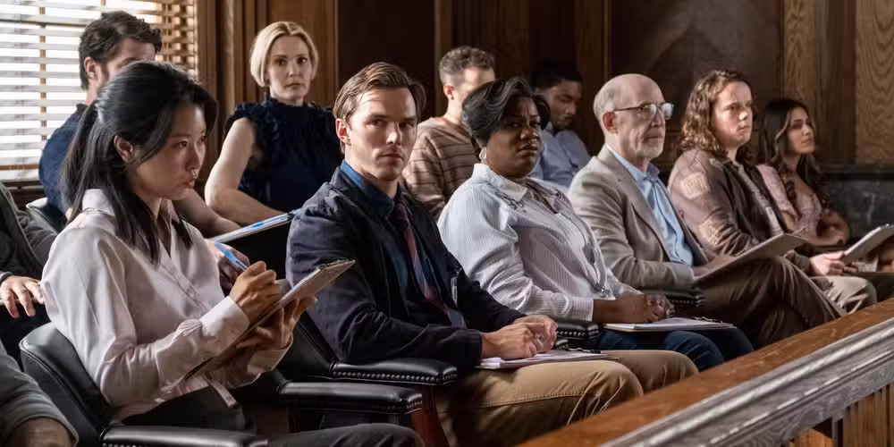 En la película, Justin (Nicholas Hoult) forma parte del jurado de un juicio por asesinato de alto perfil, solo para darse cuenta de que él es en realidad la persona detrás de la muerte de la víctima. Vemos cómo se debate entre ser honesto e ir él mismo a la cárcel, dejando en paz a su esposa embarazada, o ser deshonesto y convencer al jurado para que condene injustamente a alguien.