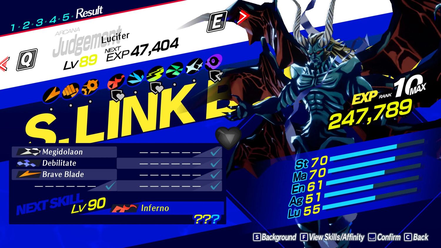 Lucifer proviene de la Arcanos del juicio y trae una amplia gama de estilos de ataque. No tiene debilidades, puede repeler los ataques oscuros y tiene un ataque listo para perforar las defensas de cualquier enemigo. En un giro emocionante, Lucifer desbloquea después de completar la solicitud número 81 de Elizabeth, en el que pide ver la habitación del personaje principal. Con la solicitud completa, podrás cumplir con el objetivo de Lucifer. Fusión especial requisitos y reunir cinco Personas demoníacas: Samael (Muerte), Abadón (Demonio), Belcebú (Demonio), Satán (Sentencia), y Infierno (Estrella).