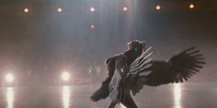 En una pista reveladora y sutil que proporciona respuestas antes de que Aronofsky revele el giro de la trama a propósito, se ve a Nina actuando en el escenario durante la lago de los cisnes actuación a través de su perspectiva, repleta de plumas ornamentadas. Sin embargo, una toma rápida y amplia desde la perspectiva de la audiencia muestra a Nina sin plumas, lo que sugiere que el plumaje está dentro de su cabeza.