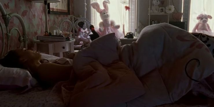 En un momento, Nina se da vuelta en su cama y se superpone directamente con el juguete del cisne negro en el fondo, haciendo que parezca que está físicamente unida a él. Además, el juguete del cisne negro está notablemente rodeado de conejitos rosados y blancos, lo que sugiere aún más su cambio de claro a oscuro.