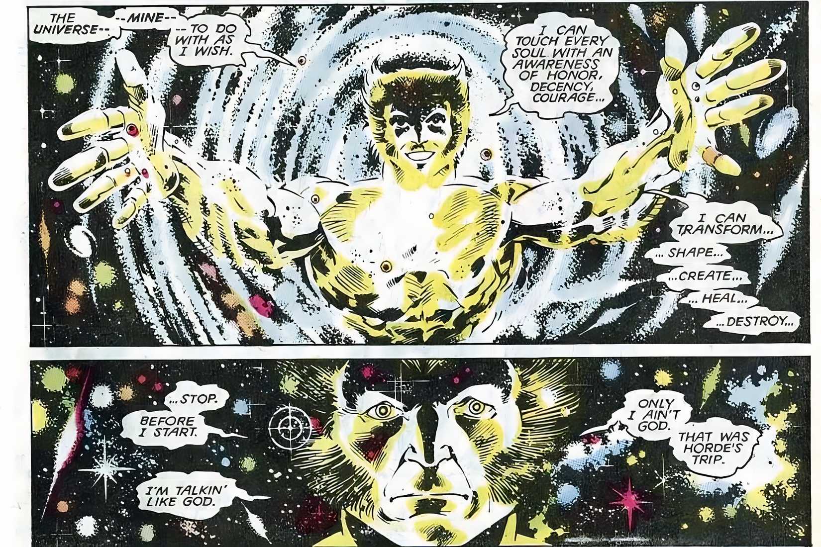 Lobezno era conectado instantáneamente con cada mente viviente en el universo, capaz de controlar cada una de sus acciones. Incluso las diminutas partículas que constituyen la realidad estaban bajo el control de Logan. Sin embargo, rápidamente se da cuenta de que este poder omnipotente no es para que lo tengan los mortales. Tan rápido como lo tuvo, Wolverine destrozó el Cristal, impidiendo que cualquier persona obtuviera su poder inconmensurable.