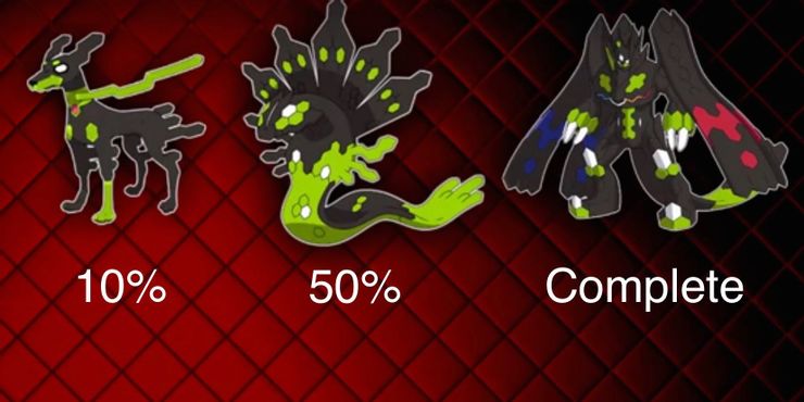 Zygarde es un Pokémon legendario que parece débil en el papel, pero su mecánica de forma única lo convierte en un Pokémon formidable en la batalla. Dependiendo de la interpretación de “forma”, Zygarde tiene tres o cinco formas entre las que cambia. En la tradición de Pokémon, Zygarde se forma cuando las células individuales se juntan en un Núcleo de Zygarde. Estos núcleos se juntan en Zygarde 10% Form, que aparece en forma de perro. Esta forma puede luego cambiar a la forma serpentina de Zygarge al 50%, que puede cambiar a la forma completa de Zygarde bípedo. En el juego, cualquier Zygarde cambiará solo entre la forma del 10% o 50% y la forma completa. Este cambio ocurre cuando cualquiera de las formas inferiores cae por debajo del 50% de salud.