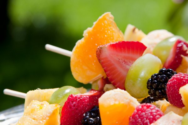 En lugar de carne y verduras a la parrilla, ¿por qué no colocar algunos trozos de frutas de colores en una brocheta? Esto hace un bocadillo divertido y saludable.