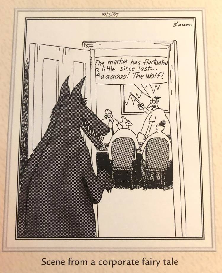El lado lejano a menudo obtuve el kilometraje de combinar diferentes géneros o temas. Entonces, en lugar de ser una franja de trabajo más directa, Larson incluye un poco de diversión de cuento de hadas. Un hombre está llevando a cabo una reunión cuando de repente es interrumpido por un lobo. Absurdo, claro, pero como todos los cuentos de hadas, es una alegoría. Después de todo, ¿hay algo más molesto que una reunión que se ve afectada por lo inesperado, ya sea una noticia repentina o un invitado sorpresa? Como todos los cuentos de hadas, este Lado lejano Strip hace todo lo posible para advertir al lector de lo que probablemente suceda en el lugar de trabajo.