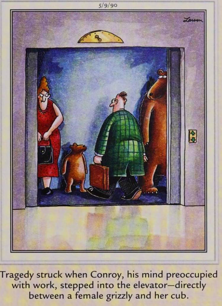 Una cosa que realmente apesta sobre el drama en el lugar de trabajo es que a veces las personas caen sin siquiera ser conscientes. Pero Como es la tradición con El lado lejanoLarson lleva las cosas a un extremo mucho más ridículo. En esta franja, un hombre se dirige al trabajo y entra en un ascensor, solo para llegar entre un oso mamá y su cachorro. De acuerdo, las personas en el lugar de trabajo no se arriesgan a ser destrozadas, pero no es raro entrar accidentalmente en medio del drama y terminar heridos como resultado. Solo agradezca que la mayoría de los lugares de trabajo no tengan osos allí.