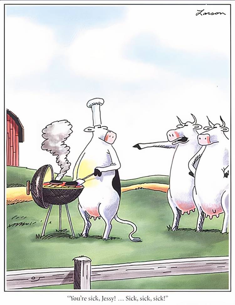 Este Lado lejano El cómic muestra una vaca cocinando en una parrilla afuera, y los vecinos de la vaca están horrorizados por lo que están viendo. La vaca parece estar cocinando hamburguesas que, como todo el mundo sabe, están hechas de carne molida de res, también conocida como carne de vaca. La implicación aquí es que la vaca está asando hamburguesas de vacas muertas con la intención de comérselas. Obviamente, esto sería muy perturbador para una vaca, ya que esta en particular es un caníbal enfermo que se come a los de su propia especie al aire libre.