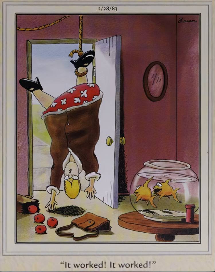 Dos peces de colores nadan en su cuenco de agua, sentados en una mesa en la casa de una mujer, observando alegremente a su dueña colgando de su pierna en la puerta. Uno de los peces dorados se vuelve hacia el otro y le dice: “¡Funcionó!” una y otra vez, lo que indica que los propios peces dorados pusieron la trampa o, al menos, orquestaron/planearon todo el asunto.