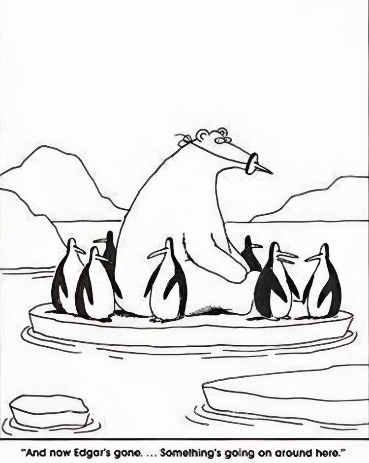 Flotando sobre un trozo de hielo, un pequeño grupo de pingüinos está nervioso porque acaba de perder a otro miembro de su colonia. Al parecer, los pingüinos están empezando a desaparecer sin dejar rastro, y los demás pingüinos están empezando a darse cuenta. Es un gran misterio, en verdad. Al menos, hasta que los lectores noten el oso polar sentado justo en el medio del trozo de hielo, que lleva un disfraz de pingüino absurdamente llamativo.