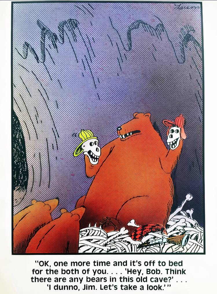La mamá osa está utilizando los esqueletos de los humanos como marionetas para recrear el momento de su muerte. Todo el mundo sabe (o debería saber) lo peligroso que puede ser un oso grizzly, especialmente cuando protege a sus cachorros, pero este cómic los presenta como sádicos retorcidos que se deleitan con la muerte de humanos.