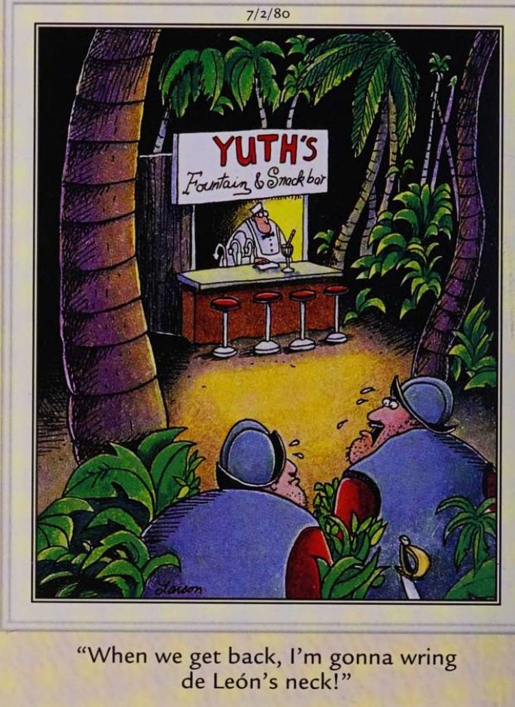 Después de una larga y peligrosa caminata a través de la jungla, dos conquistadores finalmente llegan a la fuente de la juventud que Ponce de León los ha puesto en una misión para encontrar. Sin embargo, parece haber un malentendido masivo, como lo que se creía que era La fuente de la juventud es en realidad un soporte de fuente de soda llamada yuth’s.