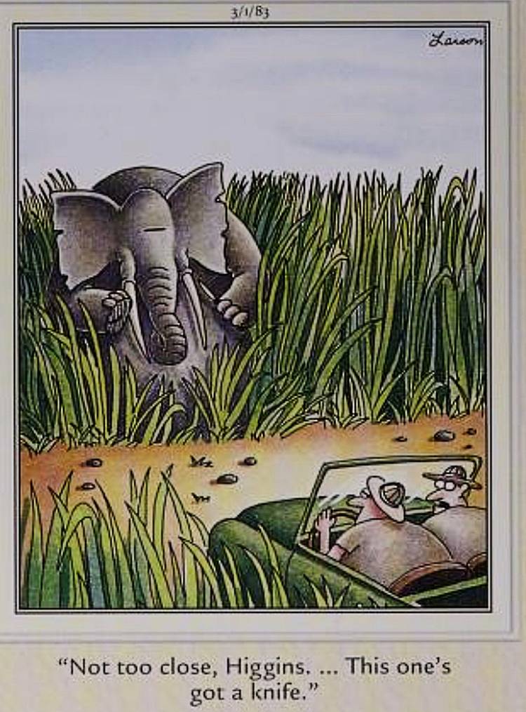 Conduciendo por la jungla, dos aventureros se enfrentan cara a cara con un elefante, pero este no es un elefante ordinario o incluso un elefante amigable. Se detienen de acercarse al elefante Porque el animal está sosteniendo un cuchillo. Es una vista bastante extraña que el elefante está parado sobre su espalda dos piernas en el medio del cepillo, pero el cuchillo agrega otra capa de extraña.