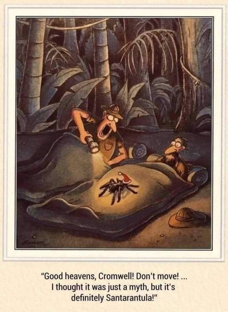 En las profundidades de la jungla por la noche, dos exploradores se despiertan con una vista aterradora (y festiva). Uno de ellos brilla su linterna en el saco de dormir de su compañero de litera para mostrarles la criatura que se creía que era un mito pero es Ahora demasiado real para ser negado: la Santarantula.