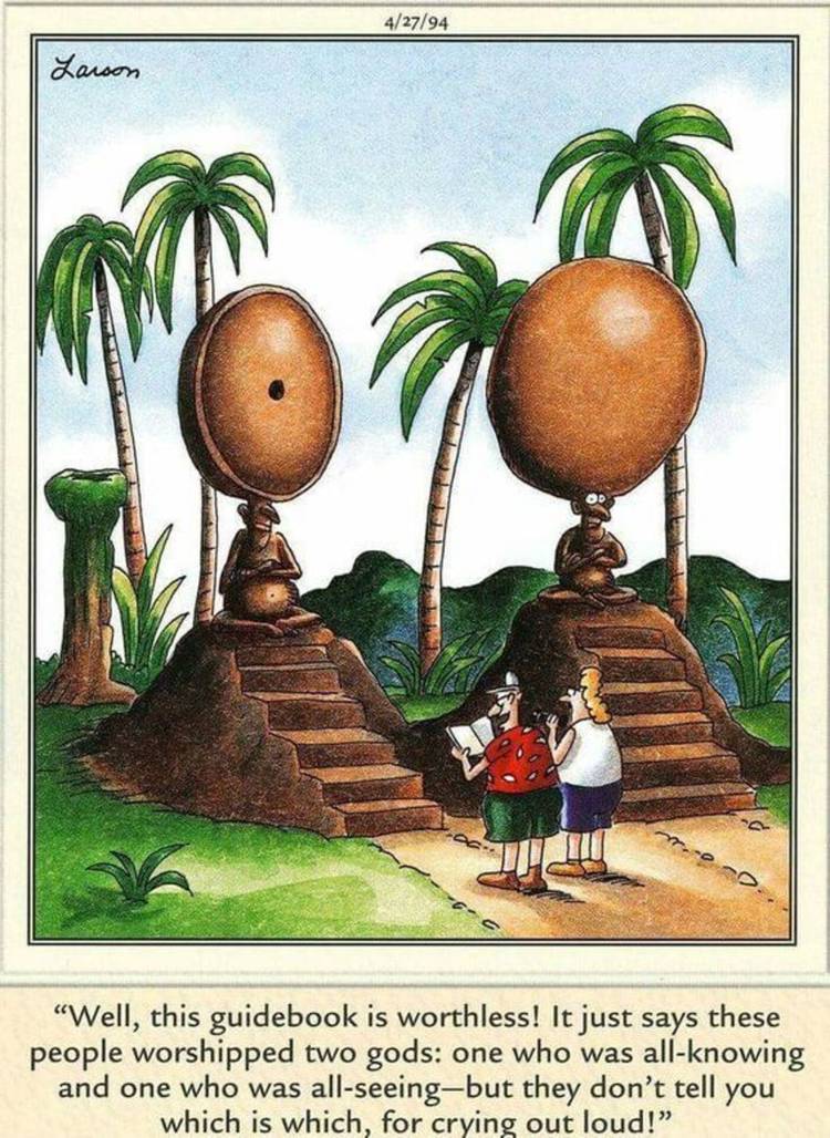 Dado que una estatua tiene un cráneo gigantesco y la otra estatua tiene un ojo gigantesco, se puede obtener que estos dos turistas no sean los más brillantes, ya que realmente no es necesario para la guía para compartir cuál es lo que, dado que es dolorosamente obvio. El lado lejano A menudo le gusta señalar la falta de despistado de la humanidad, con esta franja es un ejemplo perfecto debido a los dos personajes turísticos de ingenio que necesitan toda la guía que puedan obtener.
