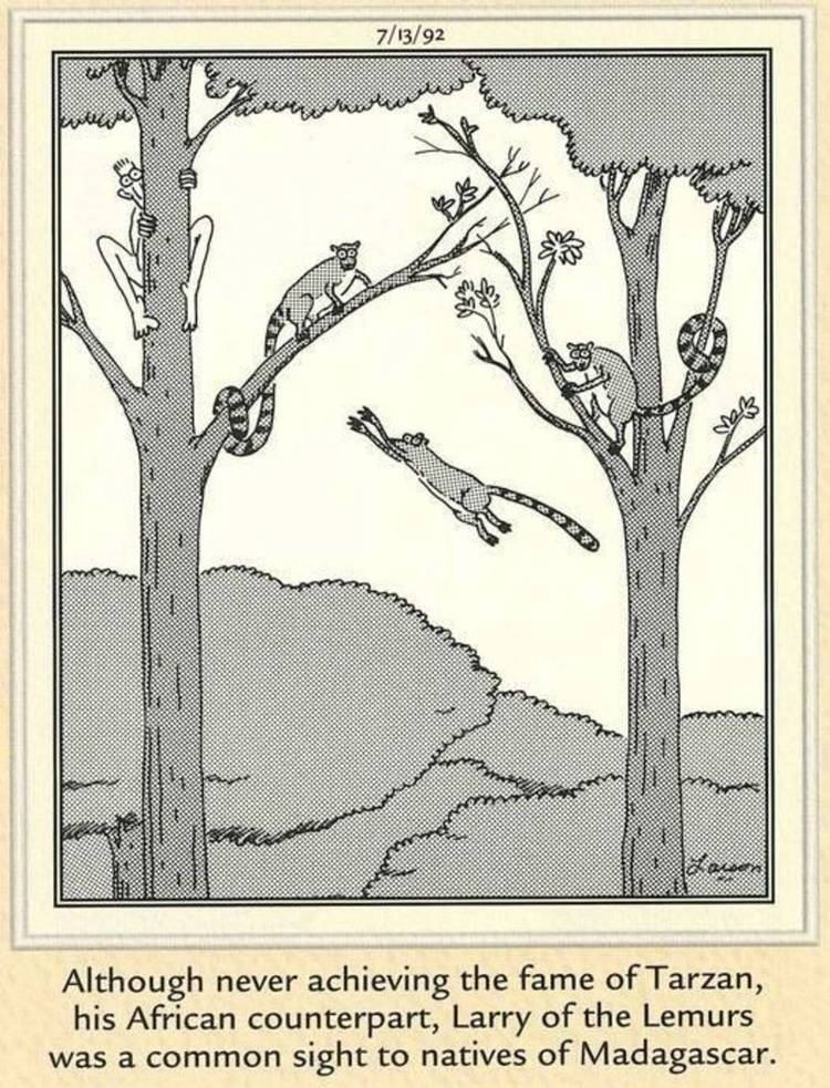 Ver a un hombre desnudo actuar como un lémur, saltar de un árbol a otro, es un secreto mejor oculto en El lado lejano. Los lémures pueden no ser tan imponentes como los simios, pero eso no significa que no puedan criar a un hombre como lo hicieron los simios para Tarzán. Larry de los lémures puede tener un buen anillo, pero aún no experimenta la fama de su amigo más conocido de la jungla.