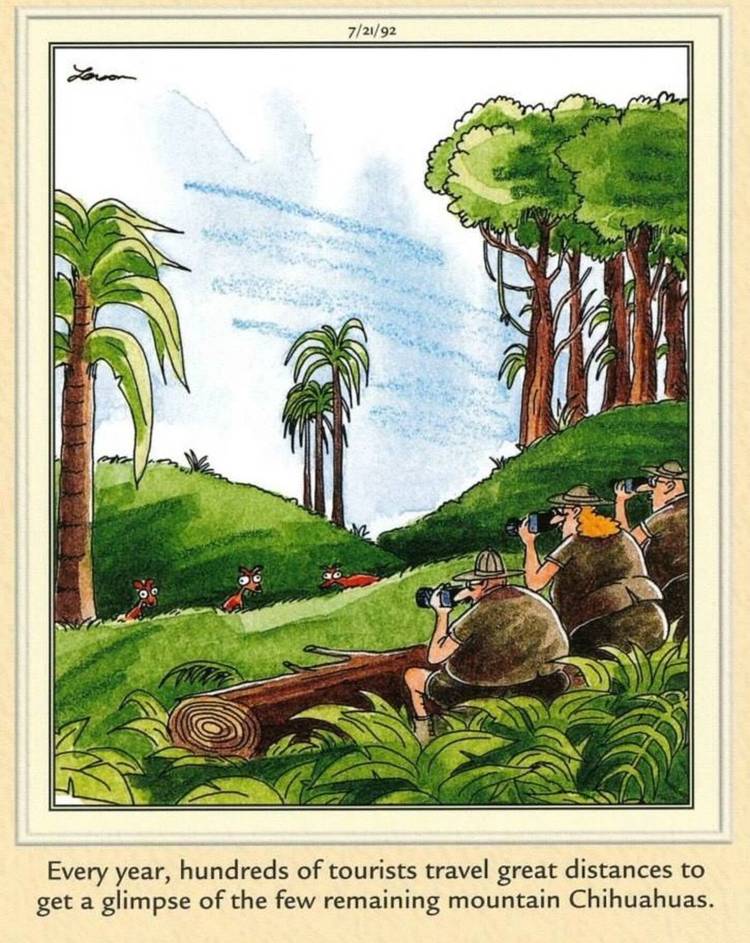 En el terreno montañoso de la jungla, Los turistas por cientos viajan solo para ver los últimos chihuahuas de montaña. Comparando estos chihuahuas de montaña con animales raros y en peligro de extinción, la elección del animal de la tira cómica crea un tono absurdo. Los chihuahuas son una raza de perro increíblemente común, y son prácticamente una moneda de diez centavos por docena.