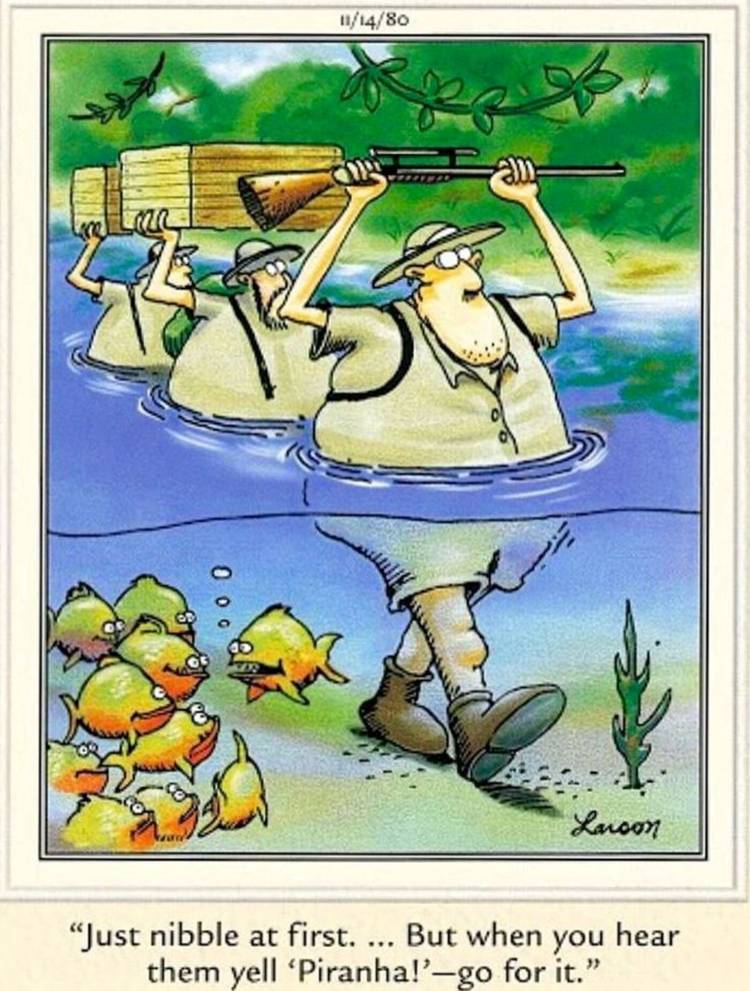 Un grupo de exploradores atraviesa las aguas de la jungla, donde pronto se encontrarán con un pez astuto en el agua. Una escuela de Piranhas hace su plan Simplemente mordisquear un poco al principio y luego, una vez que escuchan a los humanos gritar “Piranha”, para realmente ir a eso y engullir lo que pueden. Se informa que los Piranhas son increíblemente temibles y carnívoros peces, criadas de la jungla con la que ningún habitante de agua quiere acercarse.