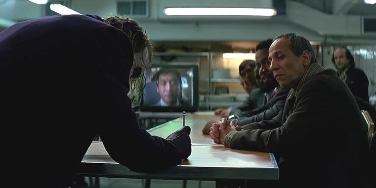 El Joker es objeto de burlas por primera vez cuando se quita la máscara al final de El caballero oscuro‘s, pero Heath Ledger realmente estrena el implacable terror de su actuación cuando el Príncipe Payaso del Crimen irrumpe en una reunión clandestina de todos los jefes de pandillas de la ciudad y propone un plan para “matar a Batman”.