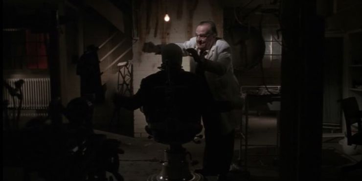Cuando se quitan los vendajes, el Guasón pide ver un espejo y luego se ríe delirante de su reflejo. Burton genera magistralmente la tensión en esta escena manteniendo la cámara detrás del Guasón, ocultando su rostro.