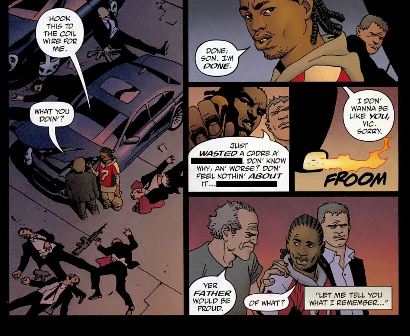 La mayoría de 100 balas El elenco no pasó de la página final, y el número en sí contenía las muertes de casi todos los personajes principales restantes, pero hubo algunos que lograron sobrevivir al número 100. Los tres personajes principales que lo hicieron fueron Loop Hughes, Victor Ray y el padre de Vic, Will Slaughter, y los personajes literalmente cabalgaron juntos hacia el atardecer, en lugar de unirse a la batalla final de la serie. Loop se introdujo en el arco de la historia “Hang up on the Hang Low”, donde el joven descubre que su padre ausente en realidad trabajó para el Trust durante años, aunque nunca como Minuteman oficial.