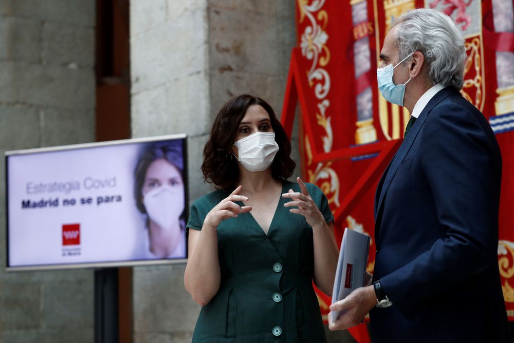 La presidenta de la Comunidad de Madrid, Isabel Díaz Ayuso, este martes. En vídeo, Ayuso explica que su Gobierno promoverá “un proyecto experimental de cartilla covid-19”