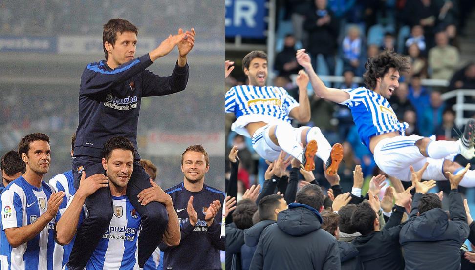 Martínez. 1.116 partidos oficiales con el primer equipo entre los tres. Para la terna, el honor y el orgullo de poder recibir el cariño de una parroquia entregada vestidos de corto, de txuri urdin, sobre el terreno de juego.