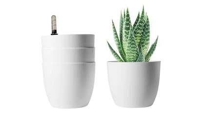 Disponibles en tres tamaños distintos: 15 cm., 18 cm. y 22 cm. de diámetro respectivamente, estas macetas vienen en un set de cuatro piezas con sus respectivos indicadores del nivel de agua, para entender el ritmo de cada planta. Es una de las más vendidas en Amazon gracias su diseño sencillo y a estar disponible en color blanco o negro.