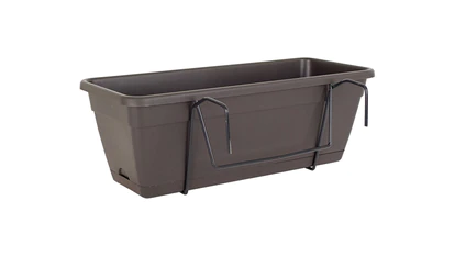 Ideal para colgar en balcones, ventanas o verjas, este kit de jardinera con reserva de agua es la opción más vendida de Leroy Merlin. Incluye base depósito y soporte. Está fabricado en polipropileno de color antracita y se recomienda para uso exterior, pues está preparado para a la planta de los rayos ultravioleta. Mide 49 cm. de largo por 16,6 cm. de alto y 19,5 cm. de fondo.