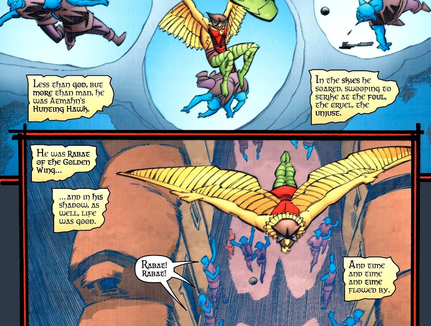 “/> Rabat el Ala Dorada formaba parte de una reflexión mitológica de la historia de Batman y Robin. Rabat era el halcón cazador de Ahtmahn, un dios oscuro de la justa venganza. Esta versión mitológica de Robin se vio en Trinidad #31 de Kurt Busiek, Mark Bagley, Art Thibert, Pete Pantazis y Pat Brosseau. Rabat finalmente fue asesinado a golpes por una secta parecida al Joker, que simbolizaba la muerte de Jason Todd a manos del Joker. En respuesta, Ahtmahn se volvió significativamente más vengativo y un dios mucho más oscuro. Esto demuestra que no importa el universo, ya sean mortales o dioses, Robin es completamente inseparable de la mitología de Batman.
