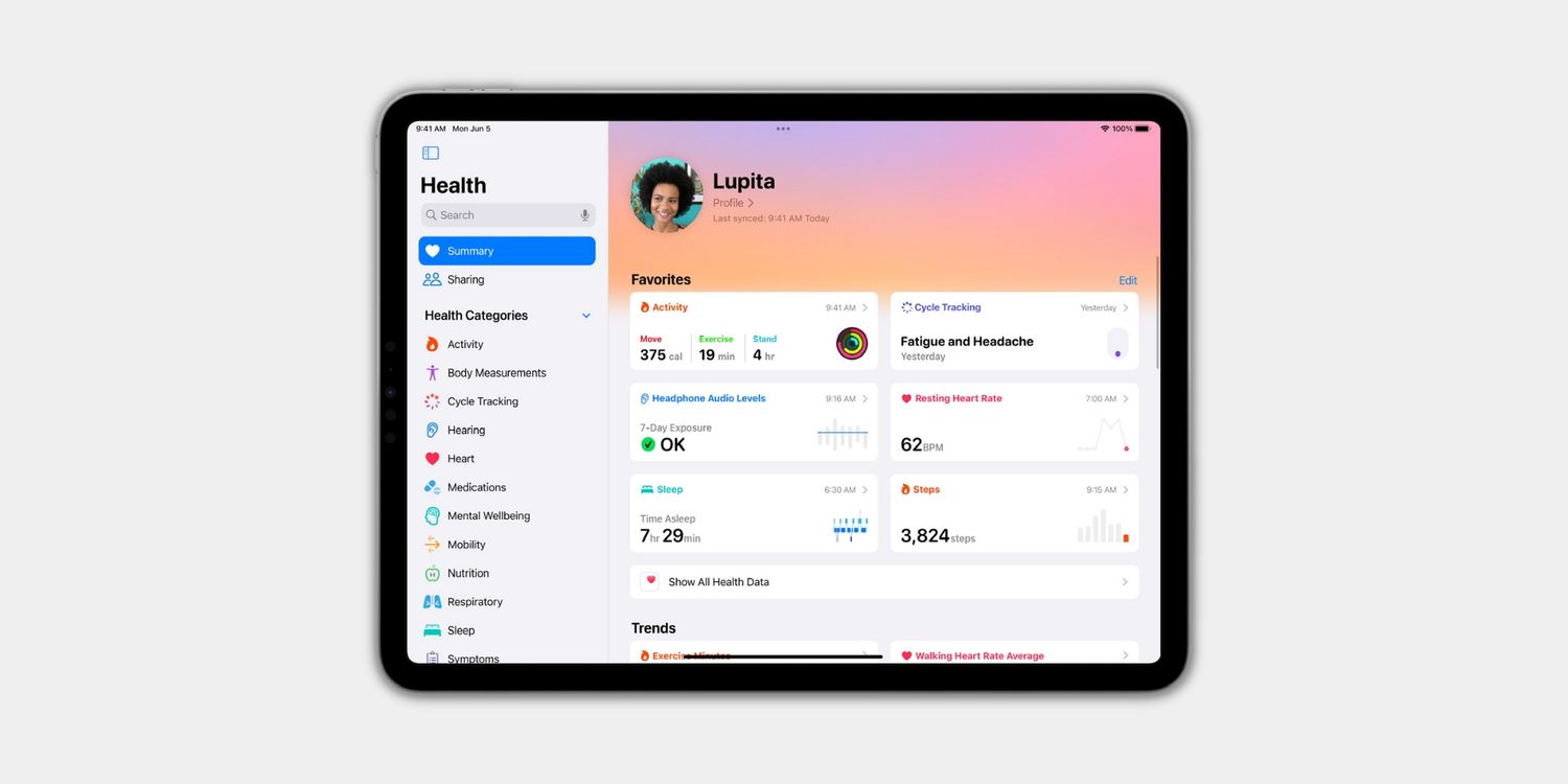 “/> La aplicación Salud existe desde hace bastante tiempo y permite a los usuarios de iPhone controlar sus actividades diarias y otras condiciones relacionadas con la salud. Sin embargo, con iPadOS 17, la aplicación también llegará a los iPads. Apple ha optimizado la aplicación para una pantalla grande, brindando a los usuarios de iPad “información sobre sus datos de salud con tendencias, aspectos destacados y gráficos interactivos detallados.“Esto ofrece funciones como recordatorios de medicamentos, seguimiento del ciclo y otros registros de salud disponibles en los iPads de los usuarios.